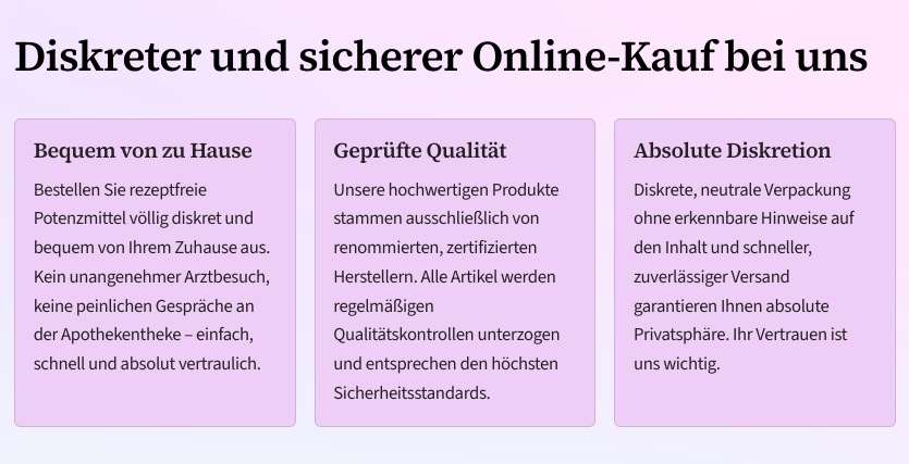 Diese rezeptfreie Potenzmittel helfen Ihnen, intensive Empfindungen zurückzugewinnen, Ihre männliche Kraft wiederherzustellen und die Intimität wieder ohne Angst vor Versagen zu genießen. Das Wichtigste ist, bewährte Medikamente mit echten Ergebnissen zu wählen und keine zweifelhaften Fälschungen.
